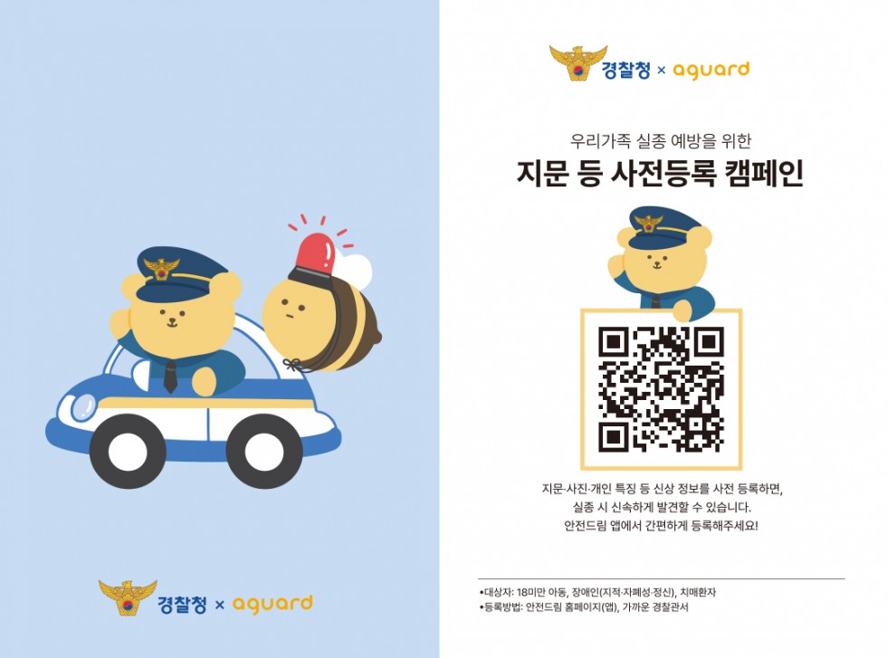 아가드는 경찰청이 진행하는 우리가족 실종 예방을 위한 지문 등 사전등록의 참여를 독려하고 실종아동 발생을 줄이는데 기여하고자 한다고 설명했다.